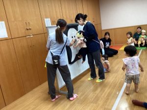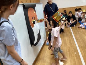 そして、歌をうたったからか子どもたちの目の前におばけのばけたくんが登場!お誕生日のお友だちから食べ物を貰って色んな姿に変身していきます。ばけたくんの姿が変わるたびに子どもたちからは大歓声があがりました。