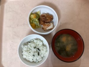わくわくの日の給食は少し特別!今日のメニューはわかめごはん、みかんサラダ、鶏のから揚げ、お味噌汁です!みんな美味しく食べました♪