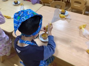 がんばってカップケーキにクリームを絞ります。バナナ味のケーキにたくさんたーくさんクリームを盛り付けました!