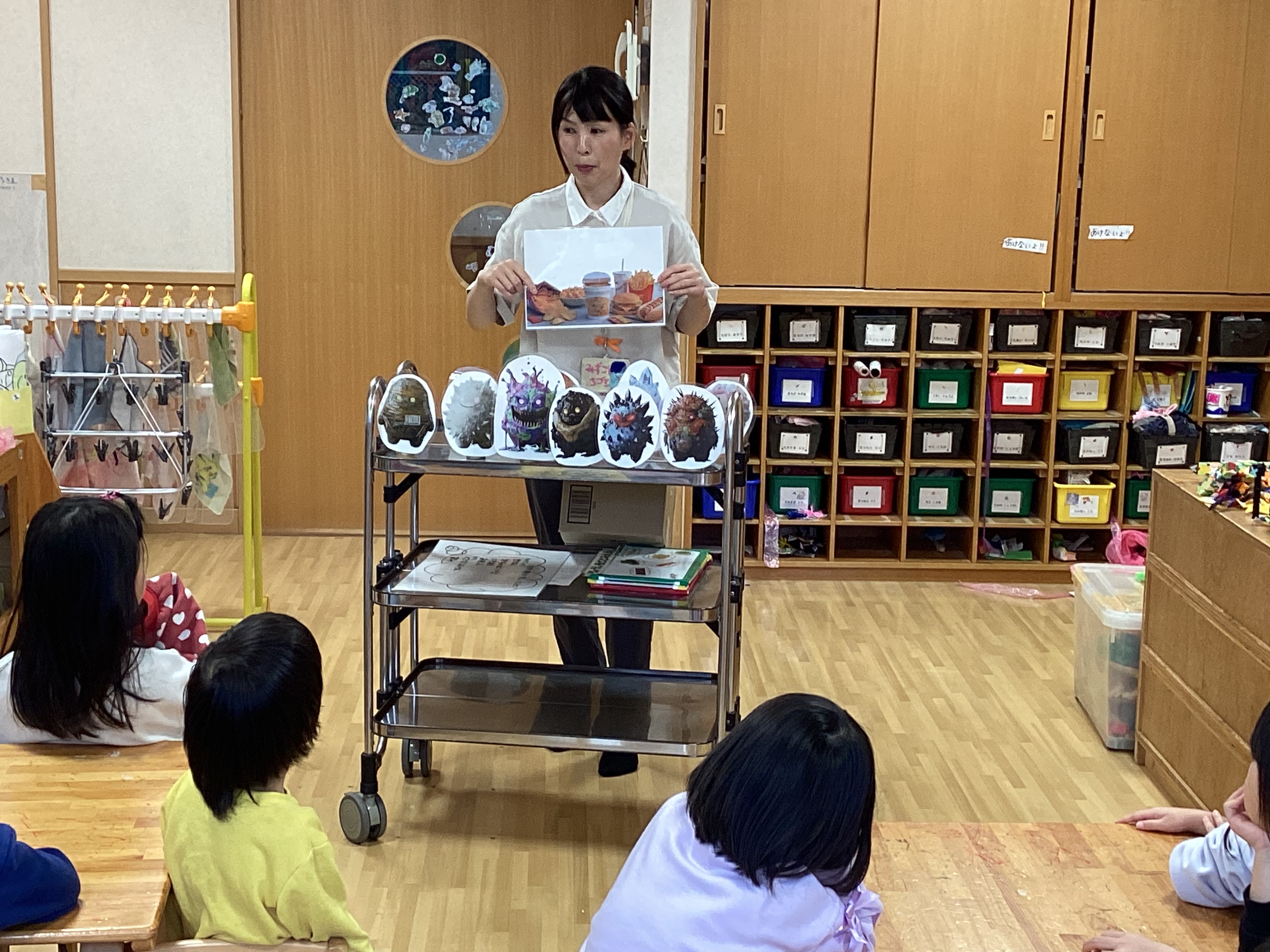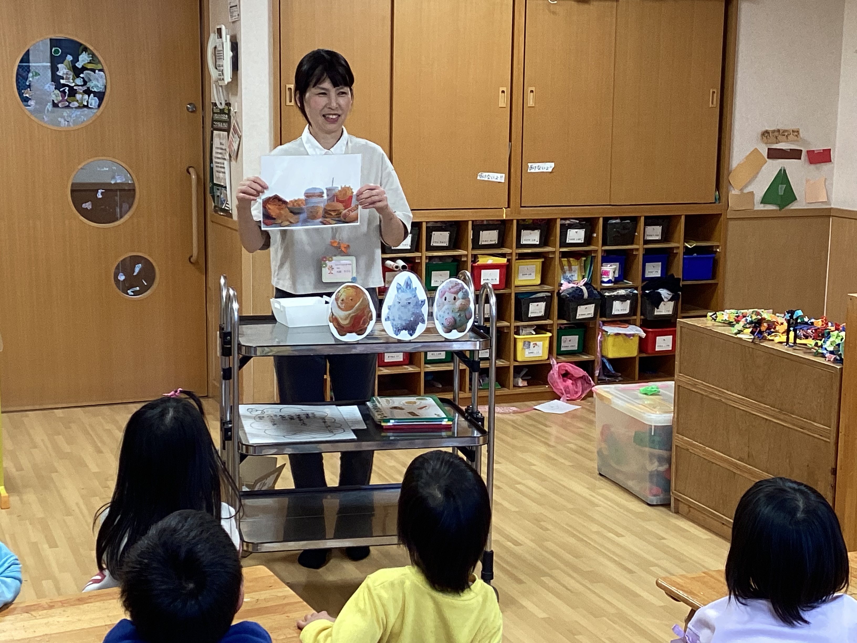 そして本日の本題へ。ワゴン手前にいるのは砂糖・塩・油の妖精さん!この子達のお陰でご飯が美味しくなります!そして給食の先生の手元にある紙にはファストフードとスナック菓子の絵が。これにも三人の妖精が居るのですが、それ以外にも妖精が居て……。