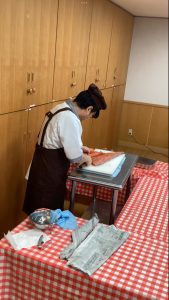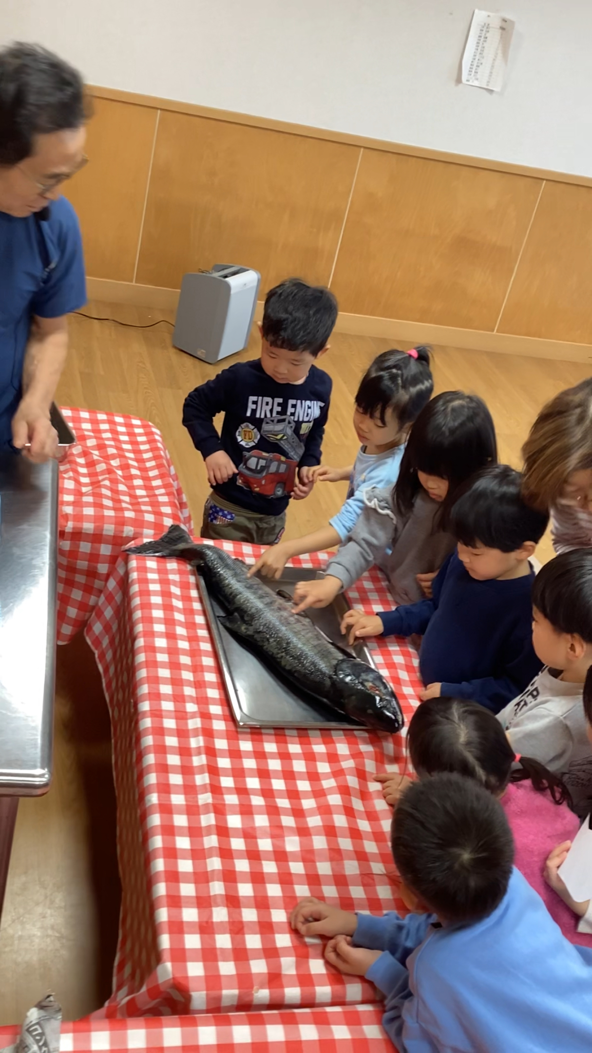 なかなか見ない魚の形のままの鮭を触ってみたり、目の前で切り身にしてもらったりとみんなの知らない料理の下ごしらえの部分を教えてもらいました。