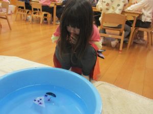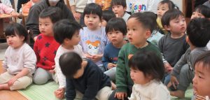 幼児さんのきれいな歌声を聞きながら目をまんまるにする乳児さん。パネルシアターにぐっと引き込まれて身体をゆらゆら揺らしひなまつりの雰囲気を味わいました。