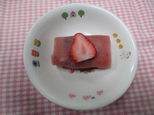 生地にいちごパウダーを入れて焼き、こしあんを包んでいちごをトッピングしました。