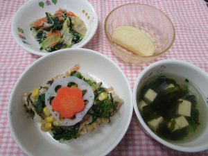 ちらし寿司はひし形に型抜きして花人参やれんこんをトッピングしました。