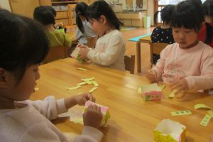 最初に、「うれしいひなまつり」を歌いながら、ひな人形を飾っていきました。