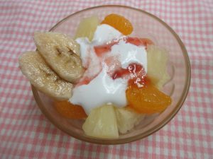 乳・卵なしのスポンジにみかん缶、パイン缶、バナナ、豆乳ホイップをのせて、いちごソースをかけて出来上がりです。