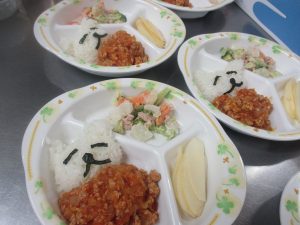 くまさん型にしたご飯に、玉ねぎたっぷりのミートソースをかけて