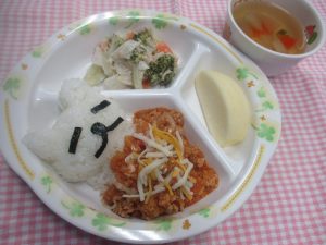 お昼寝くまさんタコライス、ブロッコリーのツナサラダ、スープ、りんご