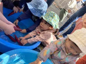 焼き芋を焼く前に午前中はまず芋洗いから始めました。テラスで準備をし始めると興味津々に集まり、寒さに負けずじゃぶじゃぶと一生懸命芋を洗っていました。