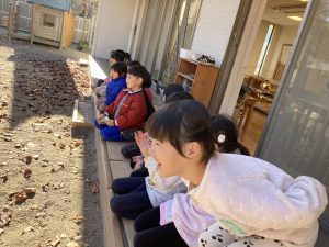 午後になり芋焼きの開始です。火が点き始めるとウッドデッキで様子を見ていたモアナ組の子どもたちが「頑張れー!!」と全力で応援してくれています。