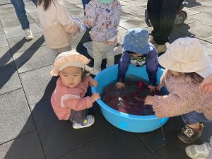 焼き芋を焼く前に午前中はまず芋洗いから始めました。テラスで準備をし始めると興味津々に集まり、寒さに負けずじゃぶじゃぶと一生懸命芋を洗っていました。