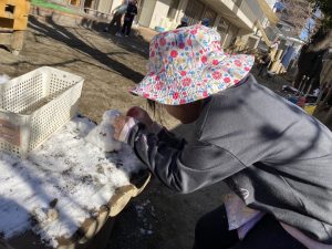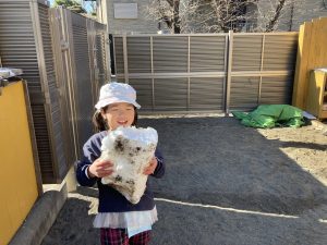 先日は関東でも雪が降り、週が明けた保育園のテラスや園庭も雪がたくさん残っていました。